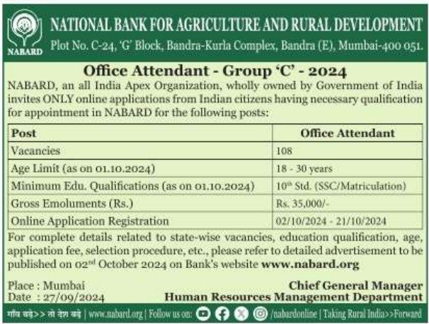 | Name of the Post: | ๐ Nabard Office Attendant Group C Recruitment 2024 Apply Online 10th Pass for 108 Post |